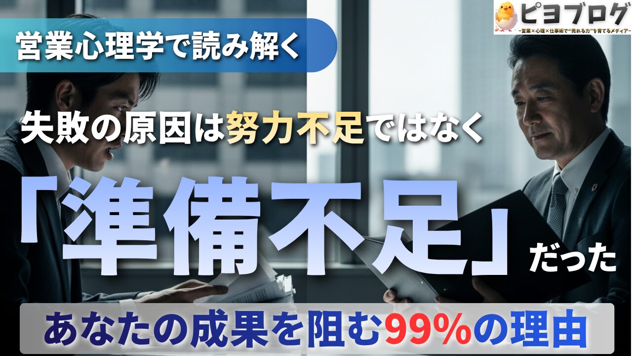 努力が成果に繋がらない営業マンへ。営業歴20年のプロが断言する、失敗の99%は「準備不足」が原因です。心理学に基づいた「準備力強化フレームワーク」で商談成功率を劇的に高める方法を解説します。