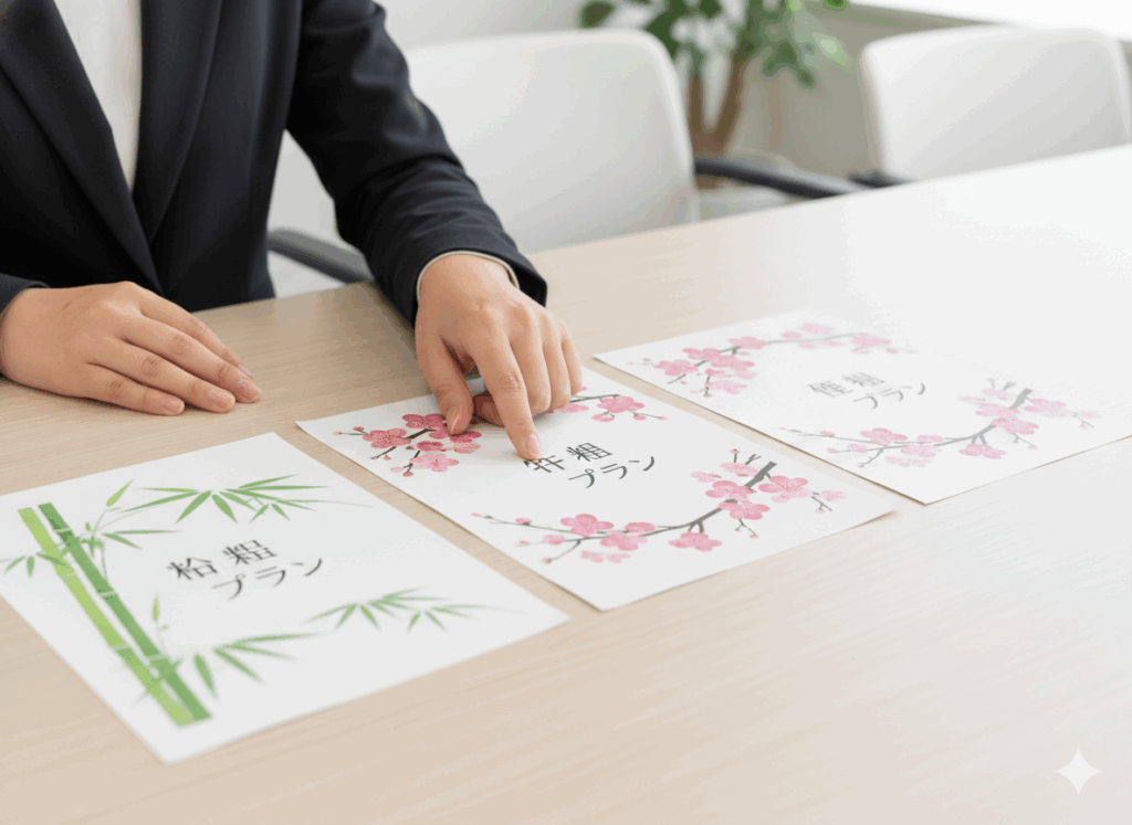• ステップ4:本命の「竹」プラン(例:70万円)を提示する。